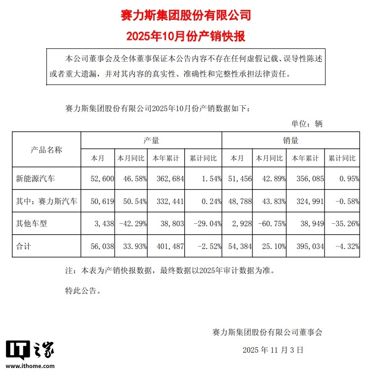据IT之家了解,在刚刚往常的 10 月,赛力斯集团总产量达 56038 辆,同比增长 33.93%;销量 54384 辆,同比增长 25.10%。赛力斯新能源汽车产量 52600 辆,同比增长 46.58%;销量 51456 辆欧洲杯体育,同比增长 42.89%。其中,赛力斯(品牌)汽车 10 月产量 50619 辆,同比增长 50.54%;销量 48788 辆,同比增长 43.83%。其他车型产量和销量均出现下滑。